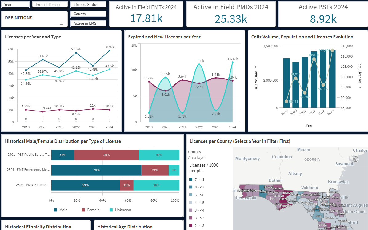 The EMS Workforce Dashboard is maintained by the Department of Health and was created to analyze EMS workforce status over the last six (6) years. The dashboard is based on Emergency Medical Technician (EMT), Paramedic, as well as Public Safety Telecommunicator (PST) licenses, and it is combined with EPCR reports to determine active licenses in the EMS field.